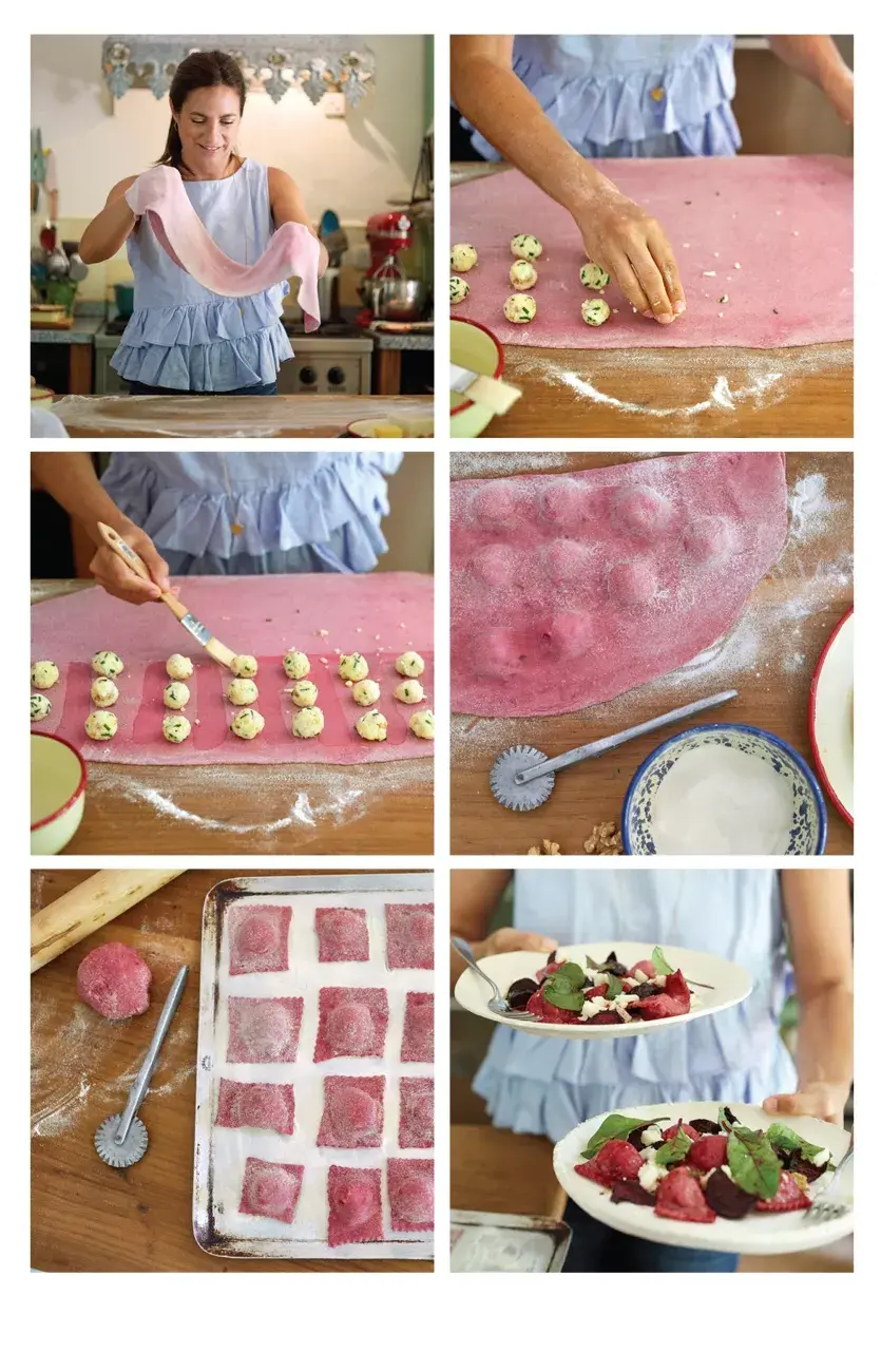 Hacer la masa de pasta colocando en un bowl la harina y la sal. Hacer un hueco en el centro y poner allí los huevos, el puré de remolacha y el aceite. Amasar un rato hasta que la masa esté lisa y homogénea. Dejarla descansar en la heladera para que se relaje.