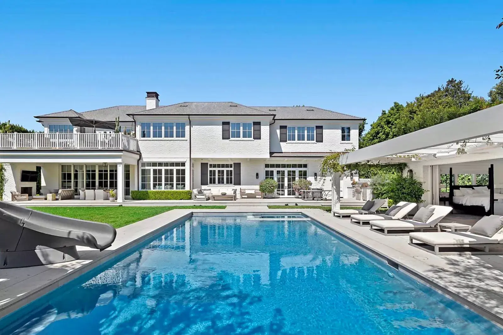 En el interior hay una pared de vidrio que conecta los interiores con el patio trasero y, además, tanto en la sala de estar interior y exterior tienen chimeneas impresionantes. La pileta, ubicada en el patio trasero, tiene bañera de hidromasaje y un tobogán.