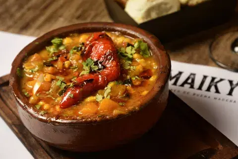 Elaborado por chef Andrés Cárdena Mendieta, esta propuesta se destaca por su sabor casero. Una versión súper potente que tiene porotos alubia, maíz pisado, puré de calabaza, cebolla de verdeo, morrón, pechito de cerdo, roast beef, osobuco, falda de res, chorizos y panceta. El plus es que sale acompañado por crujientes rodajas de pan y salsa picante.