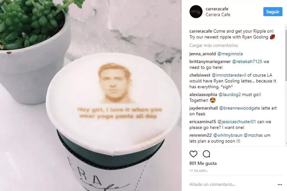 Y sin duda alguna, entre el público femenino, una de las creaciones más admiradas son las que tienen a Gosling como protagonista. Pero eso no es todo, porque al rostro del sex symbol le suman unas frases que suben el valor de la apuesta: “Oye, chica, me encanta cuando te pasas el día con tus pantalones de yoga”, dice una y otra se limita a un meme de su rostro con un simple “Hey, girl”. ¿Te dieron ganas de tomarte un latte a lo Gosling? Podés ver más creaciones en la cuenta de Instagram del café.