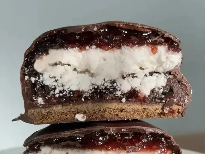 • PLATA: Chocolezza - Alfajor de chocolate y vainilla, relleno de dulce de leche repostero y cubierto con chocolate.