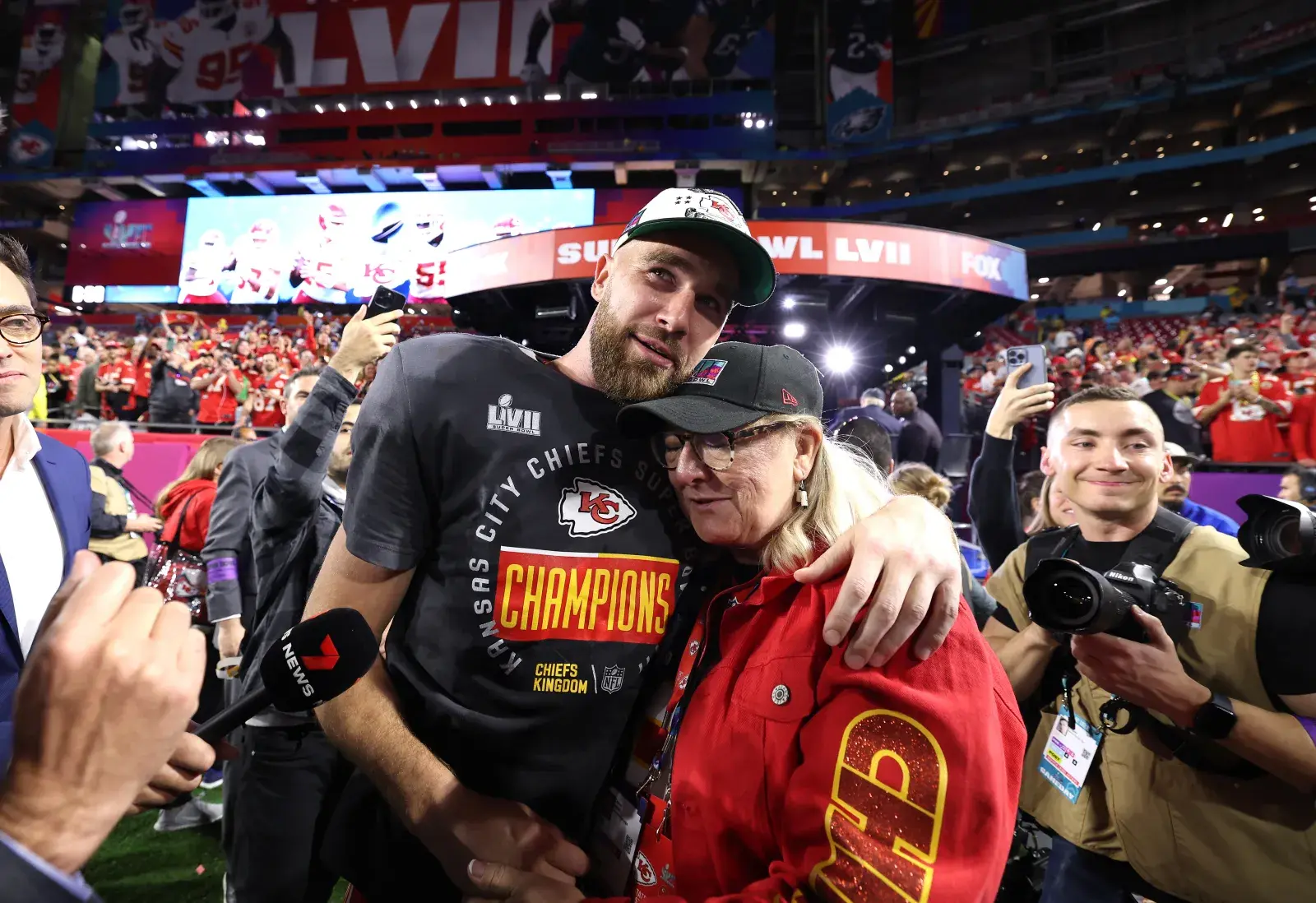 Travis Kelce junto a su mamá, durante el Super Bowl 2023. - Créditos: Getty