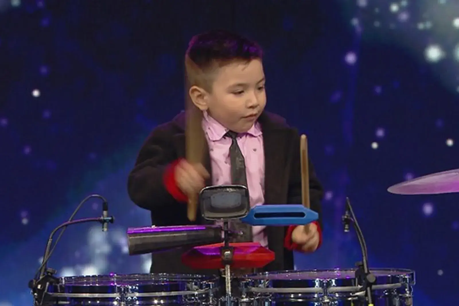 Se trata de Aythan Valentín Arias, un pequeño de 4 años de edad que logró tener la presentación más divertida de la noche al tocar los timbales.