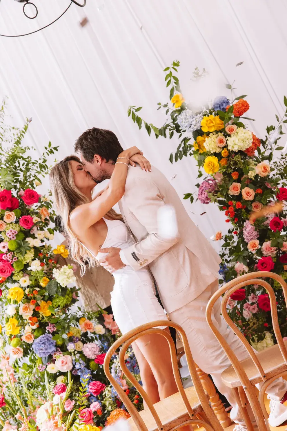 El salón estuvo repleto de flores, amigos y familia. La ambientación fue diseñada y ejecutada por de The Fun Factory, quienes llenaron de colores tanto ceremonia como almuerzo. Después de la ceremonia y de firmar las libretas, los novios almorzaron en dos grandes meses donde compartieron con las personas más cercanas un día repleto de emociones y amor.