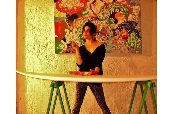 Radha no para de surfear y evitar que los acrílicos se mezclen con esmaltes y le manchen las tablas. Yoga, arte y surf, todo junto para Radha que compone muchas figuras coloridas con alguna clave espiritual. Es parte de un movimiento, no está solo, Mar del Plata alberga mucha cultura, cultura playera, cultura buena onda. Cuando visitemos La Feliz, tenemos que buscar a estos artistas para completarnos el panorama de lo que está pasando ahí, en la ciudad más grande de la Costa Atlántica.