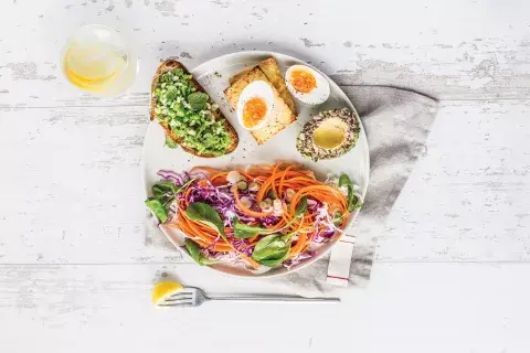Tanto en el almuerzo como en la cena, en tu mesa tienen que convivir los cuatro macronutrientes: carbohidratos, proteínas, grasas y agua. Se llaman así porque son los nutrientes que le aportan a tu cuerpo el mayor porcentaje de energía que necesita. En este plato, te mostramos las porciones recomendadas de distintos tipos de alimentos para cumplir con tu cuota de "macros" diaria.