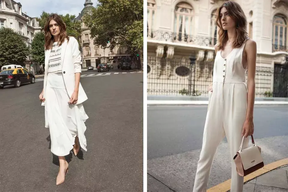 Izquierda: blazer y top ($4900 y $1200, Tucci), falda (Cher), zapatos (Prüne, $2290). Derecha: enterito (Paula Cahen D’Anvers, $3100), cartera (Lazaro, $1890).