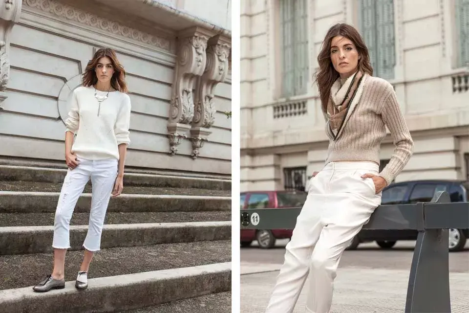 Izquierda: suéter (Complot $1500), jeans (Wanama, $1690), collar (India Style, $290), zapatos (A Pie, $2150). Derecha: polera (Levi´s, $1980), pantalón (Paula Cahen D’Anvers, $2200), pañuelo (Paula Cahen D’Anvers, $1980).