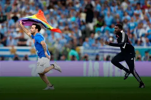 Con una remera que decía "Respeto por las mujeres iraníes" y "Salven a Ucrania", así como una bandera arcoiris en la mano; el hincha corrió en la cancha durante el partido entre Uruguay y Portugal.