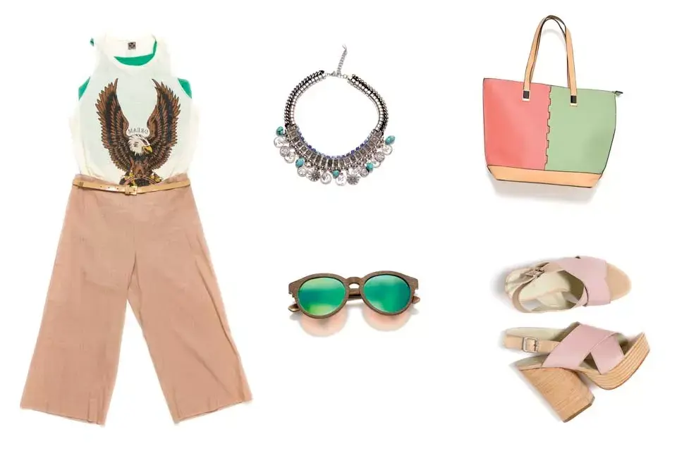 Sudadera, Cook, $430. Top, Complot, $250. Cinturón, Besha, $290. Pantacourt, Sathya, $1500. Collar, India Style, $440. Gafas, Fleur, $1700. Cartera, Basement, $800. Sandalias, Blaqué, $2100.