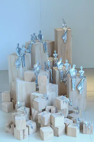 ¿Qué es? Una instalación que muestra diferentes parejas hechas con aluminio, pulido y sin pulir, sentadas sobre madera de paraíso.