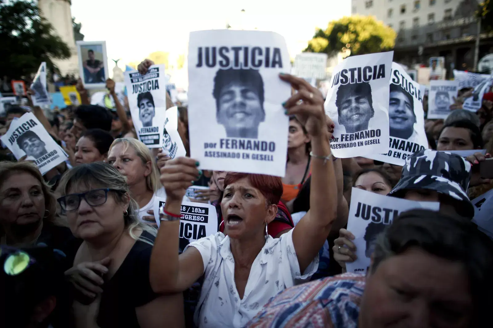 Personas sostienen carteles del difunto Fernando Báez Sosa con el mensaje en español: "Justicia por Fernando, asesinado en Gesell". - Créditos: Foto AP/Natacha Pisarenko/Archivo LA NACION