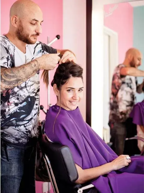 Es una peluquería chic, luminosa y espaciosa (al principio era solo un departamento y hace un par de meses sumaron el vecino). Trendy cual casa de decoración, sobresale una pared empapelada con rayas en blanco y negro, muebles de madera cancheros y varios adornos vistosos. Los dos balcones, con mesas y sillas de hierro, tienen una linda vista palermitana y son el lugar donde Harrison, la mascota del estudio, descansa durante las jornadas de sol.