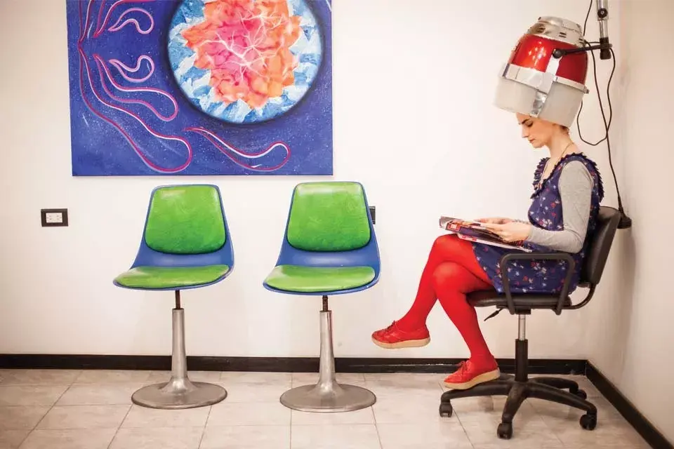Es un departamento en un último piso amplio y lleno de luz, con paredes pintadas de rosa, verde y amarillo. Apenas entrás, está la recepción, con una mesa que actúa de biblioteca en la que no hay revistas, solo libros de fotos, de ilustraciones y crucigramas. El sector de piletas se instaló en el pasillo, y al fondo, tres sillas enfrentadas a grandes espejos para atender a las clientas. El highlight del salón: dos terracitas con una vista urbana espectacular.