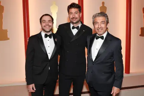 Santiago Mitre, junto a Peter Lanzani y Ricardo Darín, en la entrega de los Oscar. - Créditos: Getty.