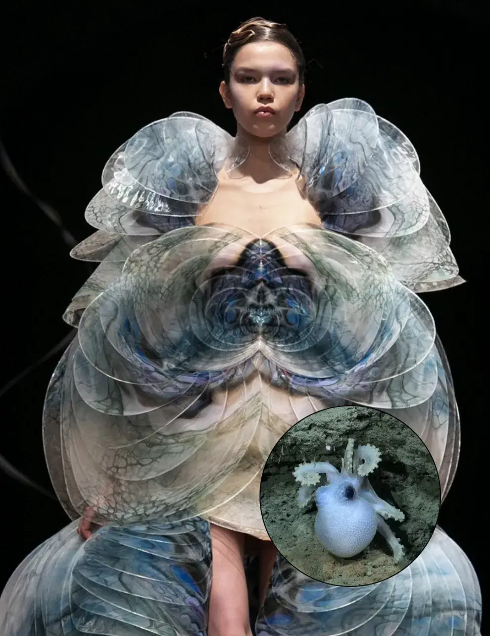 Comparación de una especie del fondo del mar en Mar del Plata con un Vestido Amethystina de la colección Roots of Rebirth de Iris van Herpen. - Créditos: Twitter/@revistapola.