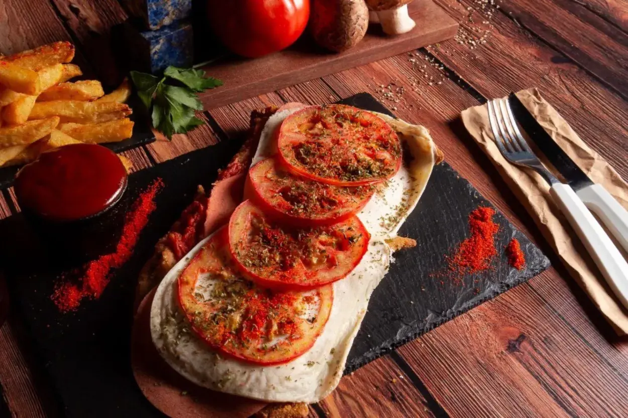Combo: milanesa napolitana vegana (milanesa de seitán, salsa de tomate, muzzarella de almendras, jamón de arroz, rodajas de tomate) y papas fritas. Bebida: jugo de naranja o agua.