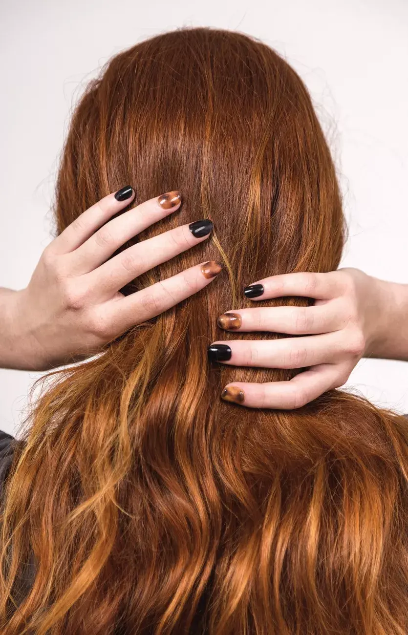 El tiempo de pintarse todas las uñas del mismo color ya fue. Hoy se llevan combinadas y, si querés ir por más, haciendo match también con tu tono de pelo o make up elegido. En este caso, elegimos uñas carey (el nuevo hit instagramero) combinadas con negro y con un pelirrojo vibrante. Las uñas carey solo se pueden lograr con esmaltes en gel y acrílico especial para uñas. Lo mejor para hacerte este tipo de nail art es pasar por un beauty bar y aprovechar la manicura para hacerte algo jugado.