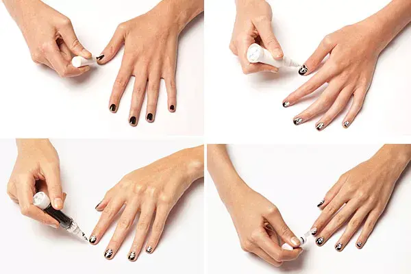 1. Prepará la uña como hacés habitualmente (remové cutículas, poné algún fortalecedor) y pintá una base color negra.