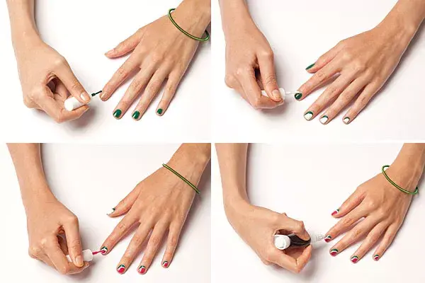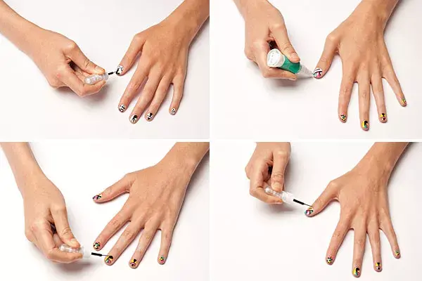 2. Una vez que esté completamente seco, rellená los espacios en blanco con distintos colores. Elegí los mismos colores para cada uña, pero repartilos distinto.