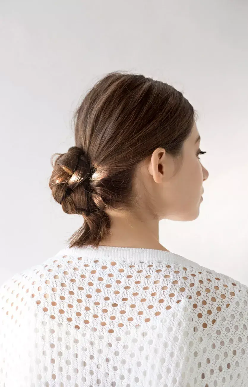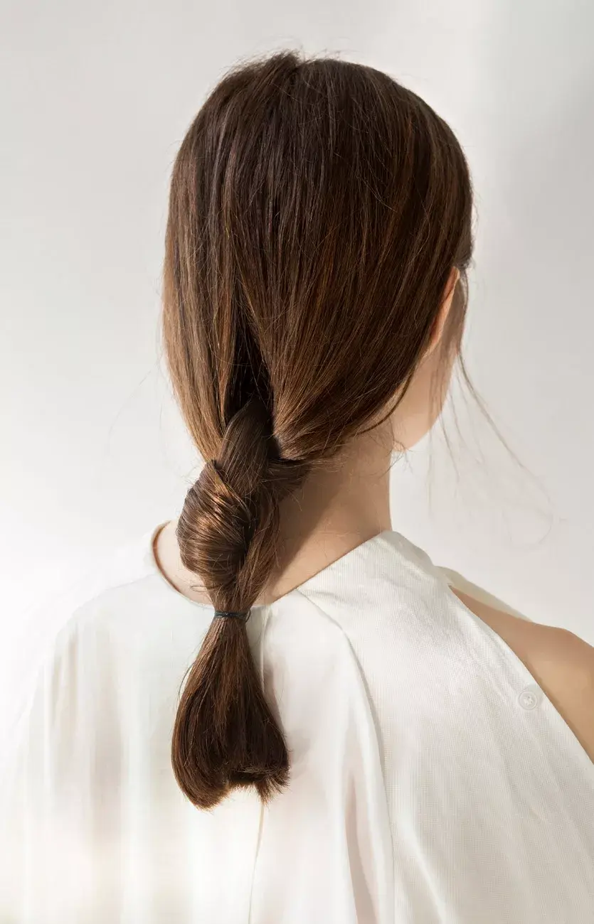 Para esta alternativa a la clásica trenza, dividí el pelo en dos a la altura de la nuca y hacé un nudo normal. Ajustalo bien y hacé otro nudo, y así todo lo que te permita el largo de tu pelo. Para que sea más fácil de manipular y el mechón se mueva todo junto, podés poner cera o serum en las dos divisiones del pelo. Atalo con una gomita.