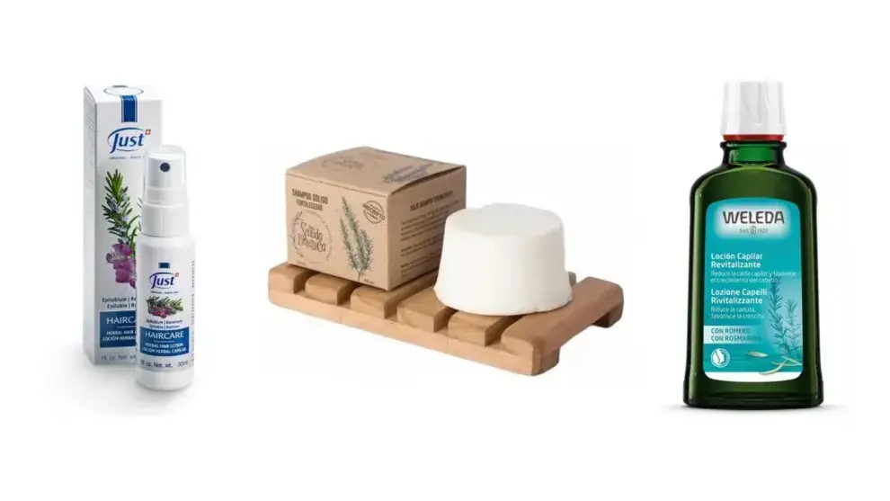 Izquierda: Loción Herbal Capilar (Swiss Just). Centro: Shampoo fortalecedor (Sentida Botánica). Derecha: Loción Capilar de romero (Weleda)