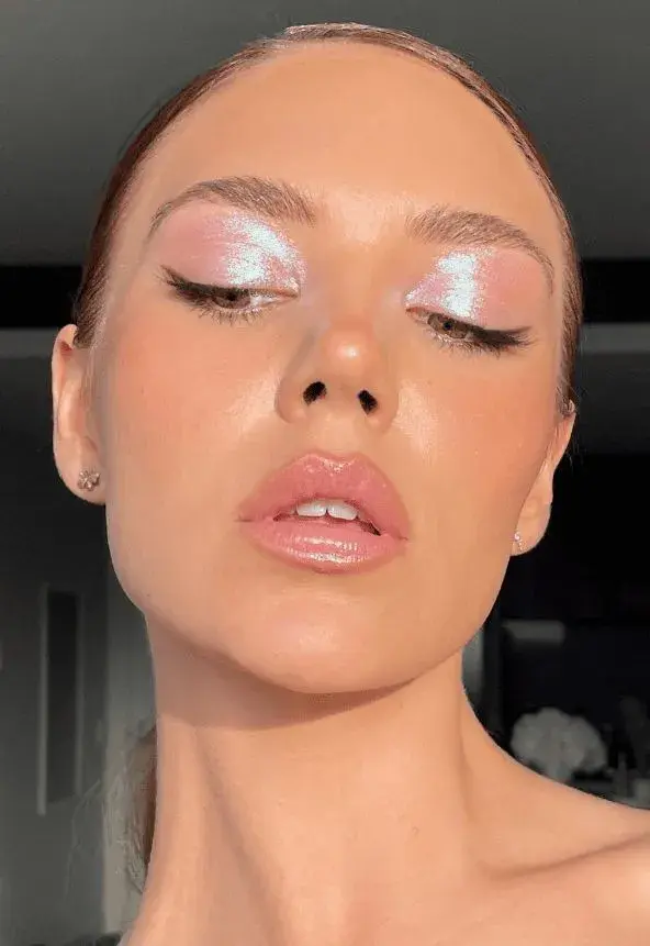 Aplicá sombras satinadas en tonos metálicos fríos (plata, gris claro, hielo). Podés sumar un delineado difuso con brillo sutil para dar definición sin perder la estética etérea.