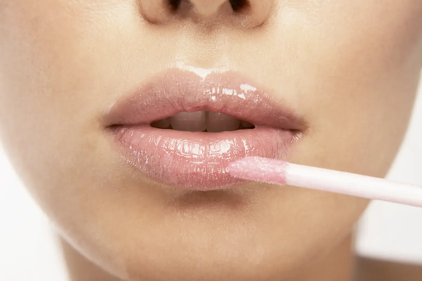 Terminá con brillo: Frunce los labios, aplica un tono carne en el centro y sella con gloss transparente en el contorno para lograr un efecto voluminoso y jugoso.