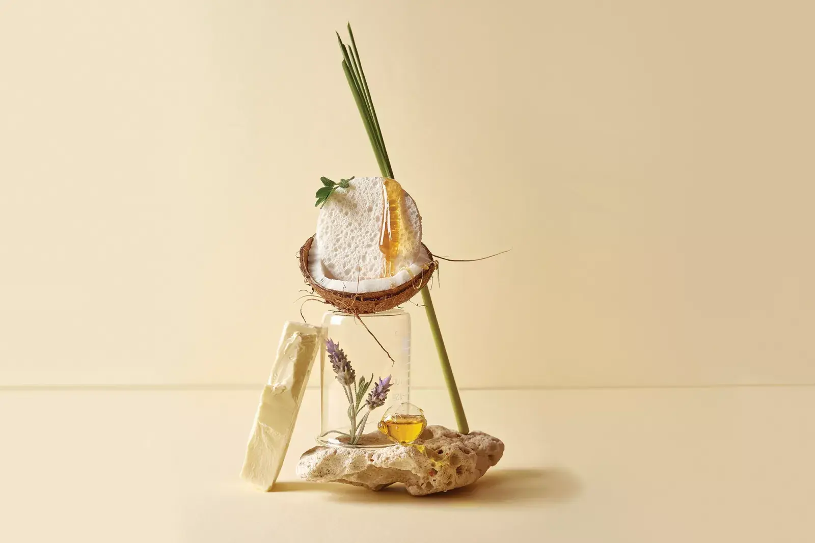 ¿Qué lleva? 3 cucharadas de aceite de coco / 2 cucharadas de manteca de cacao / 3 cucharadas de fécula de maíz / 2 cucharadas de bicarbonato de sodio / 10 gotas de aceite esencial de lavanda / 15 gotas de aceite esencial de tea tree