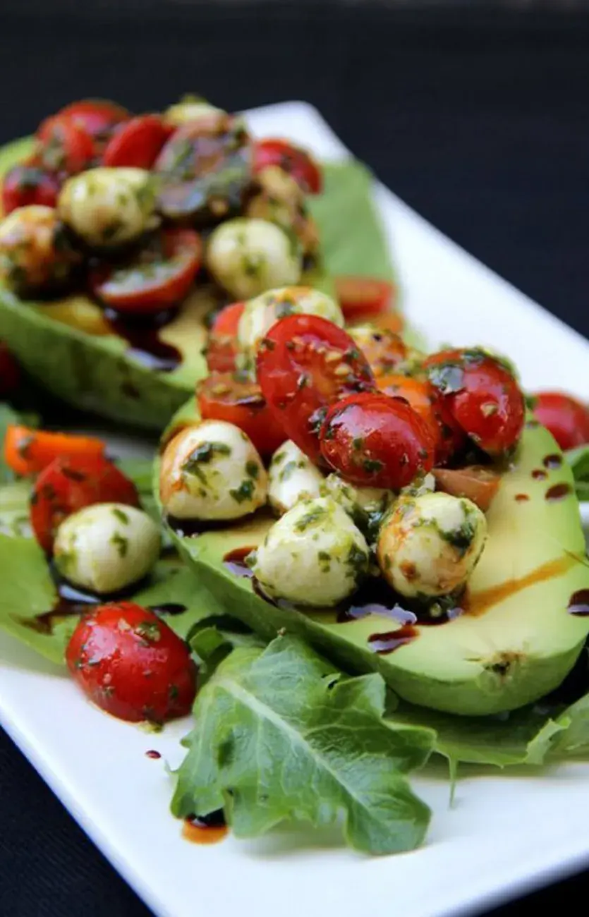 Palta con boconcino y cherry: 4 paltas, 300 g de tomates cherry cortados en mitades, 200 g de boconcinos de mozzarella, 100 ml de aceite de ajo, 6 cucharaditas de aceto balsámico de módena. En un bol, colocá todos los ingredientes del relleno (menos las paltas) revolvé y dejá macerar las mitades de tomate, las perlas de mozzarella y el aceite de ajo, removemos bien y dejamos macerar mientras preparamos el resto de la receta. A continuación, cortá las paltas en mitades y retirá el hueso. Rellená cada mitad con la mezcla y finalizá rociando con aceto. Servilo frío, una mitad por persona.
