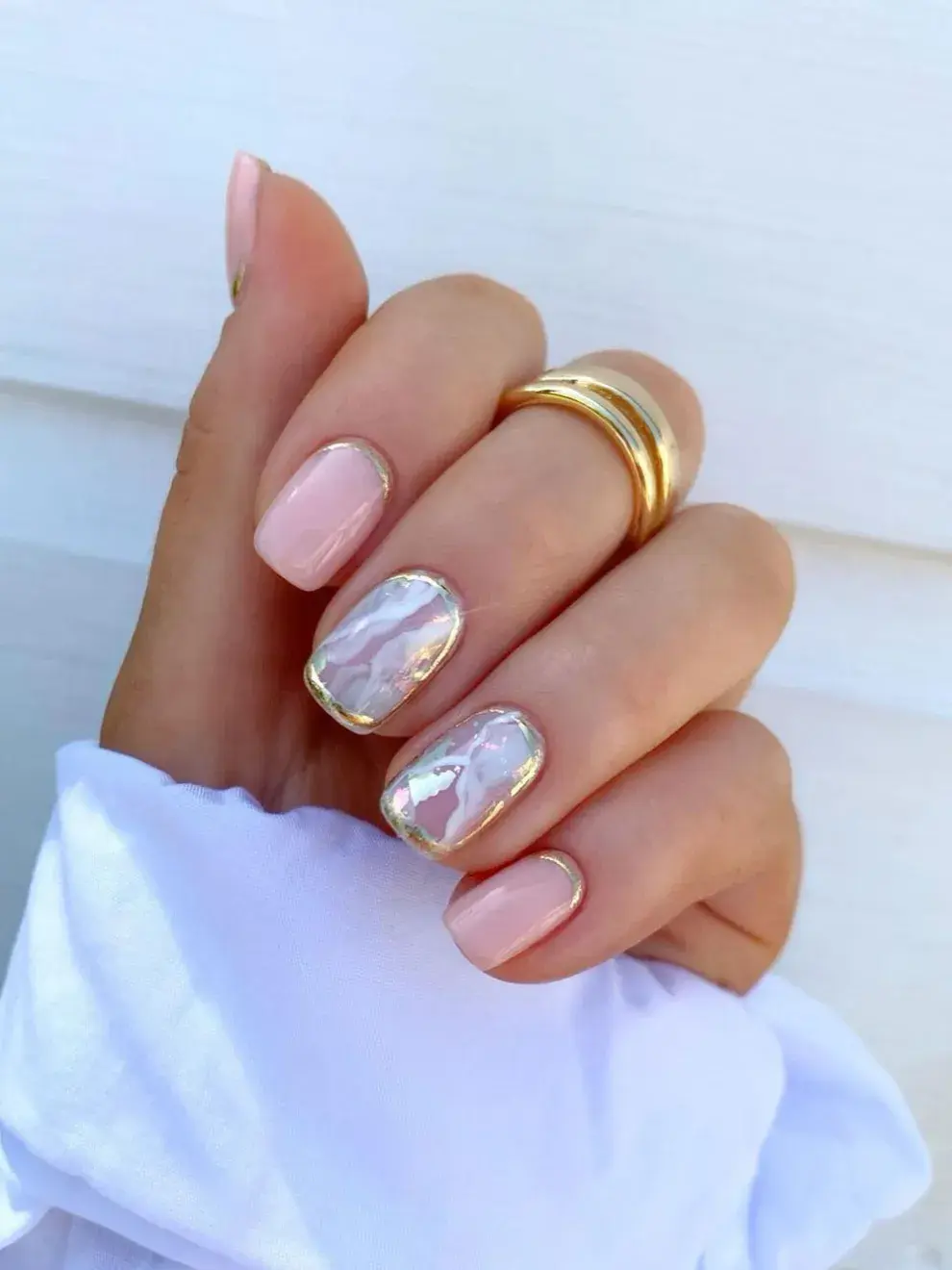 Rayas finísimas, pequeños marcos, mini estrellas o formas geométricas en acabado metalizado sobre bases claras o pastel. Este tipo de nail art es perfecto para uñas cortas porque suma diseño sin “acortar” visualmente la uña.
