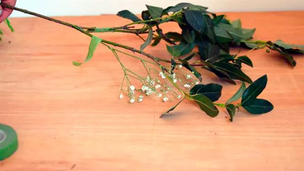 Paso 1. Armá el camino verde. Cortá varias ramitas de los diferentes verdes para formar el camino del largo que deseemos cubrir en la mesa. Con la cinta floral verde, vas a unir entre sí las ramitas, intercalando los diferentes tipos de follaje.