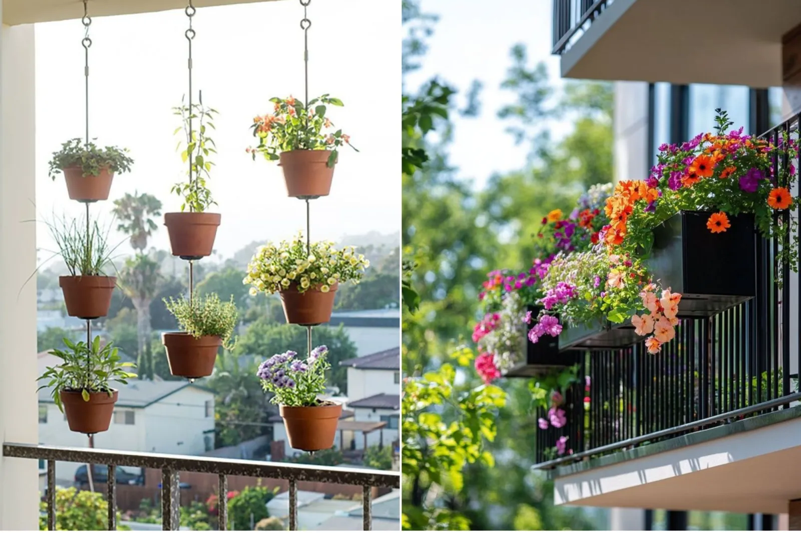 Cuando el balcón es reducido, las macetas colgantes son una de las mejores soluciones. Se pueden colocar en el techo, en ganchos o incluso en estructuras metálicas.