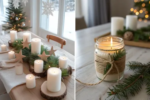 Creá centros con velas blancas, ramas verdes y elementos de madera o piedra clara. Una composición limpia y ordenada transmite equilibrio y armonía, ideal para disfrutar la mesa con tranquilidad.