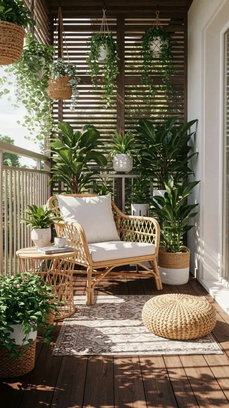 Los materiales naturales ayudan a reforzar la sensación de calidez visual. La madera, el ratán, el mimbre o las fibras vegetales funcionan muy bien en balcones de otoño porque aportan textura y un aire más acogedor.