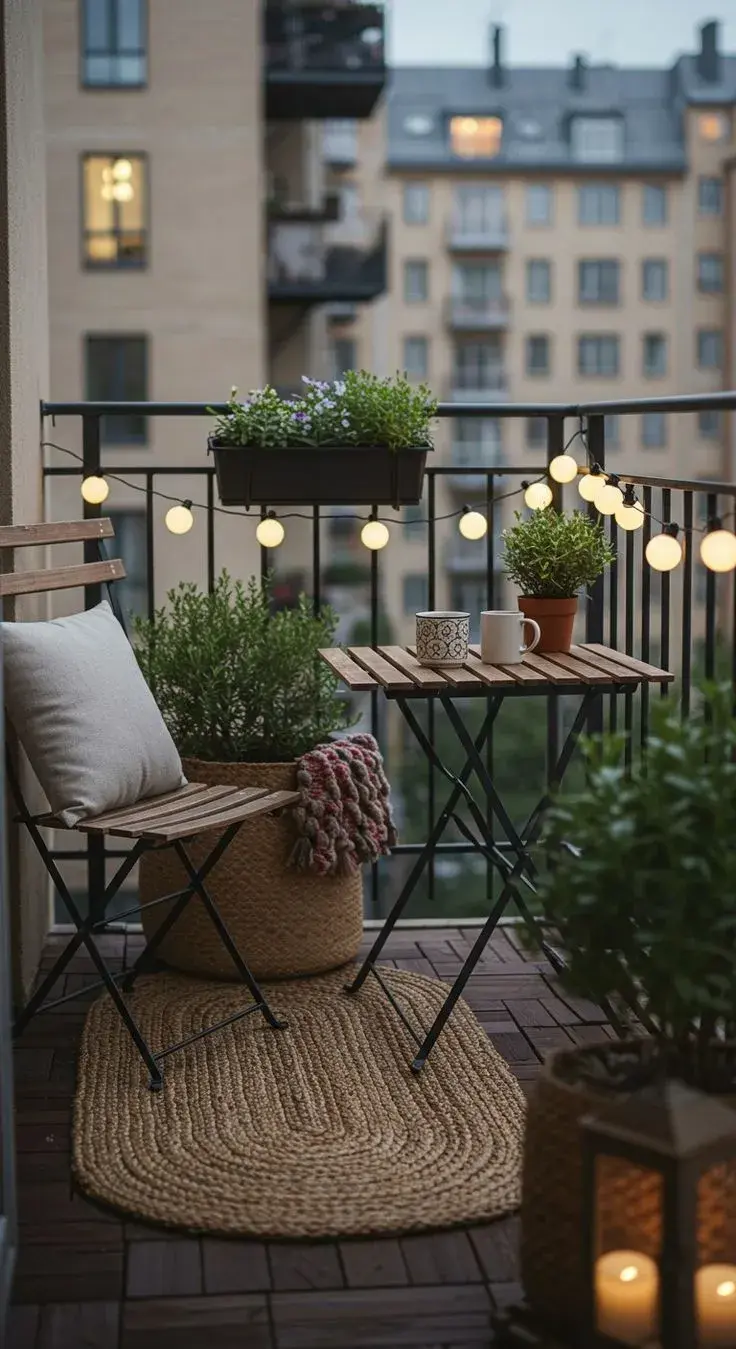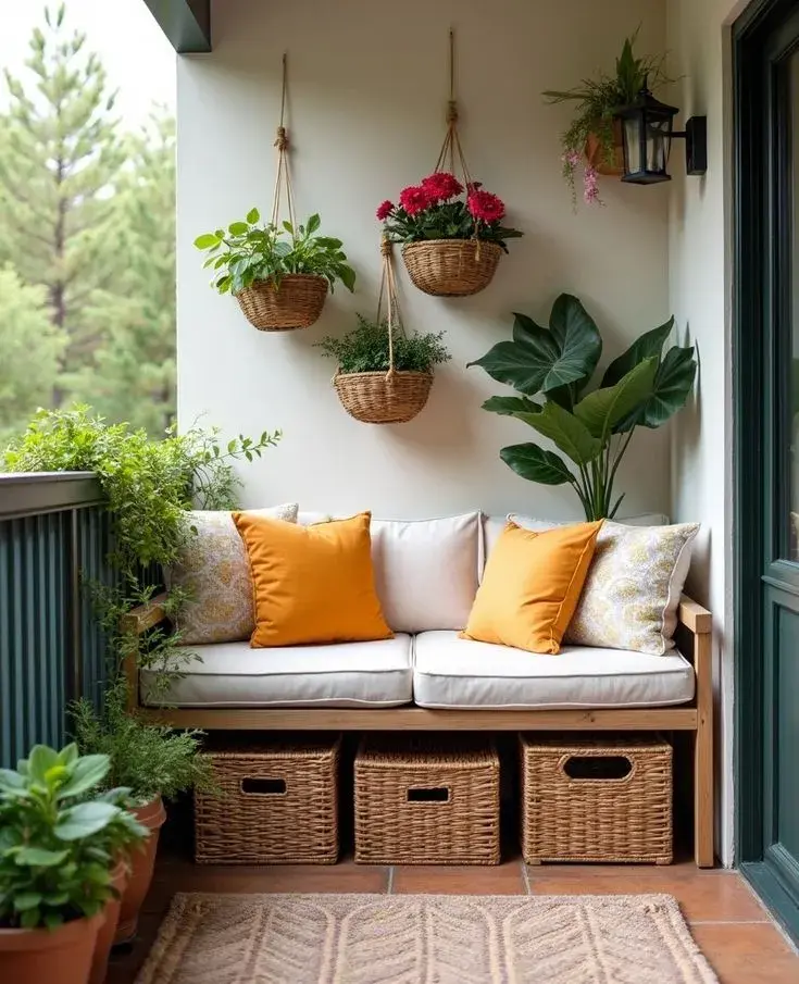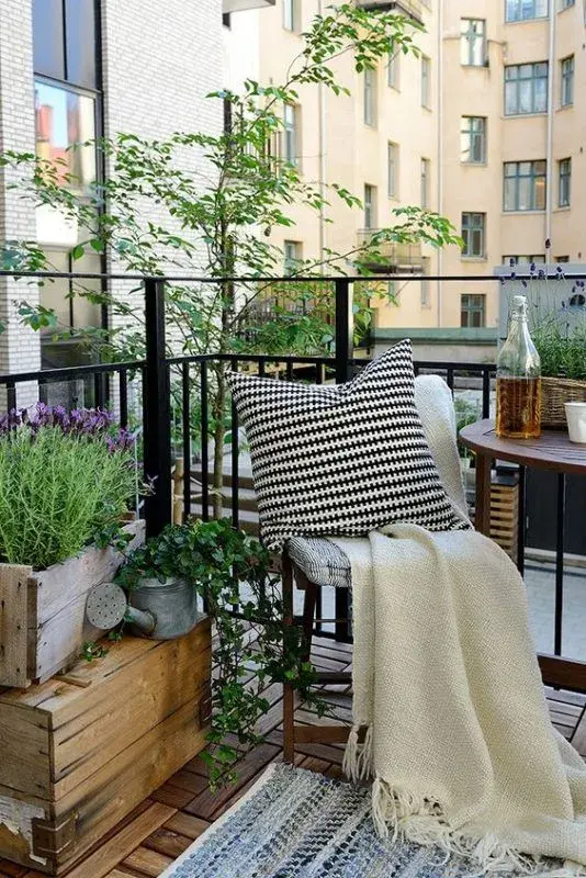 Aunque el balcón sea pequeño, vale la pena pensar en un sector cómodo para sentarse. Una butaca, una silla plegable con almohadón o incluso un banco con mantas pueden convertirse en el lugar ideal para tomar un café, leer o simplemente disfrutar del aire fresco.