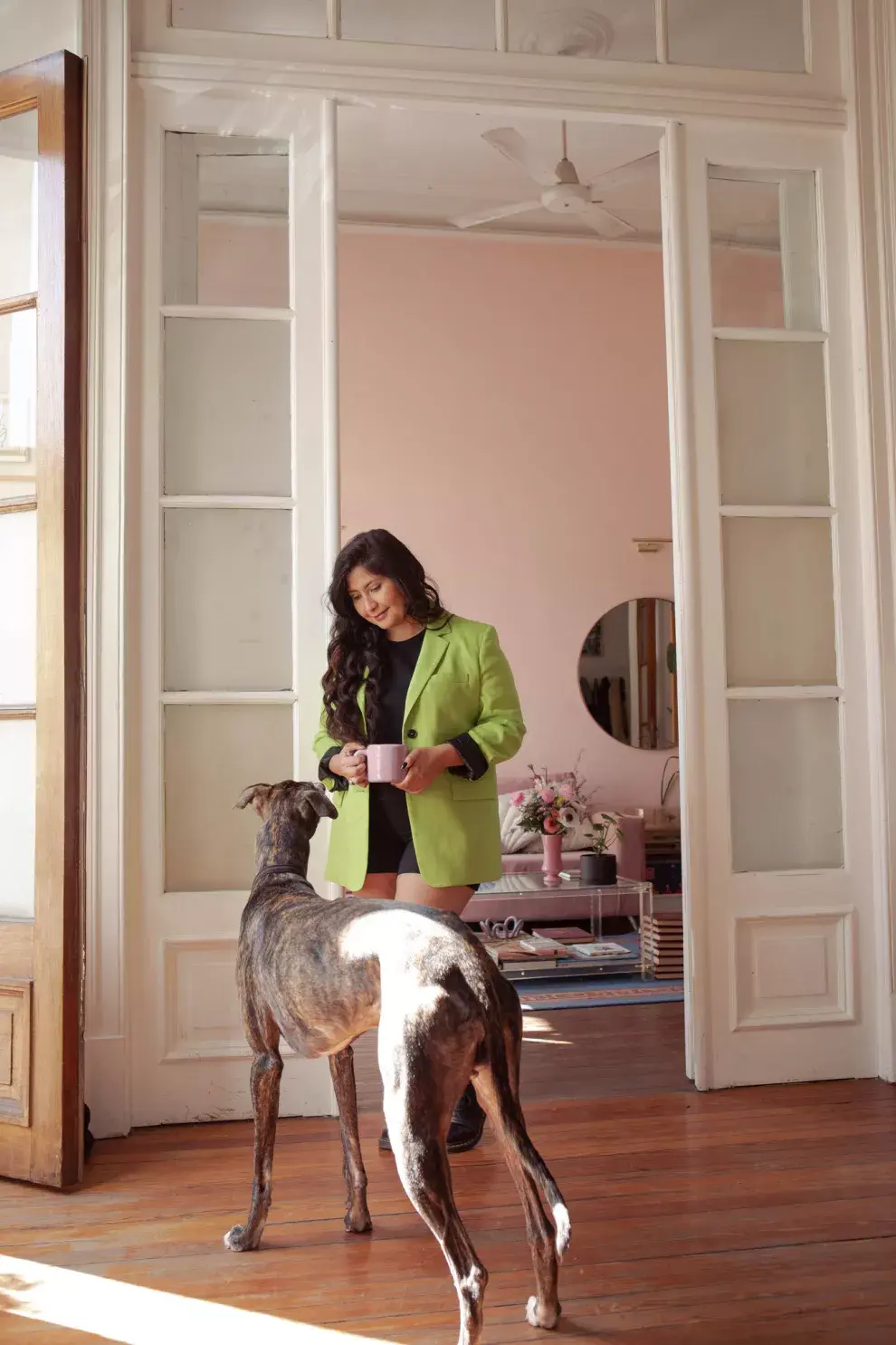Con techos de más de tres metros de altura, molduras y pisos de pinotea (clásico de un edificio de principios del siglo pasado), el departamento de la calle Chile es el lugar ideal para  la ilustradora y su pareja, que es diseñador. En la casa dialogan sus propias obras con las de otros colegas y amigos, además de los muebles y objetos de diseño que recolectaron a lo largo de los años. Las flores (@herederadelsol), las plantas y Kiwi, un galgo que se adueñó de la casa, completan el cuadro en este departamento que tiene toda la bohemia de San Telmo.