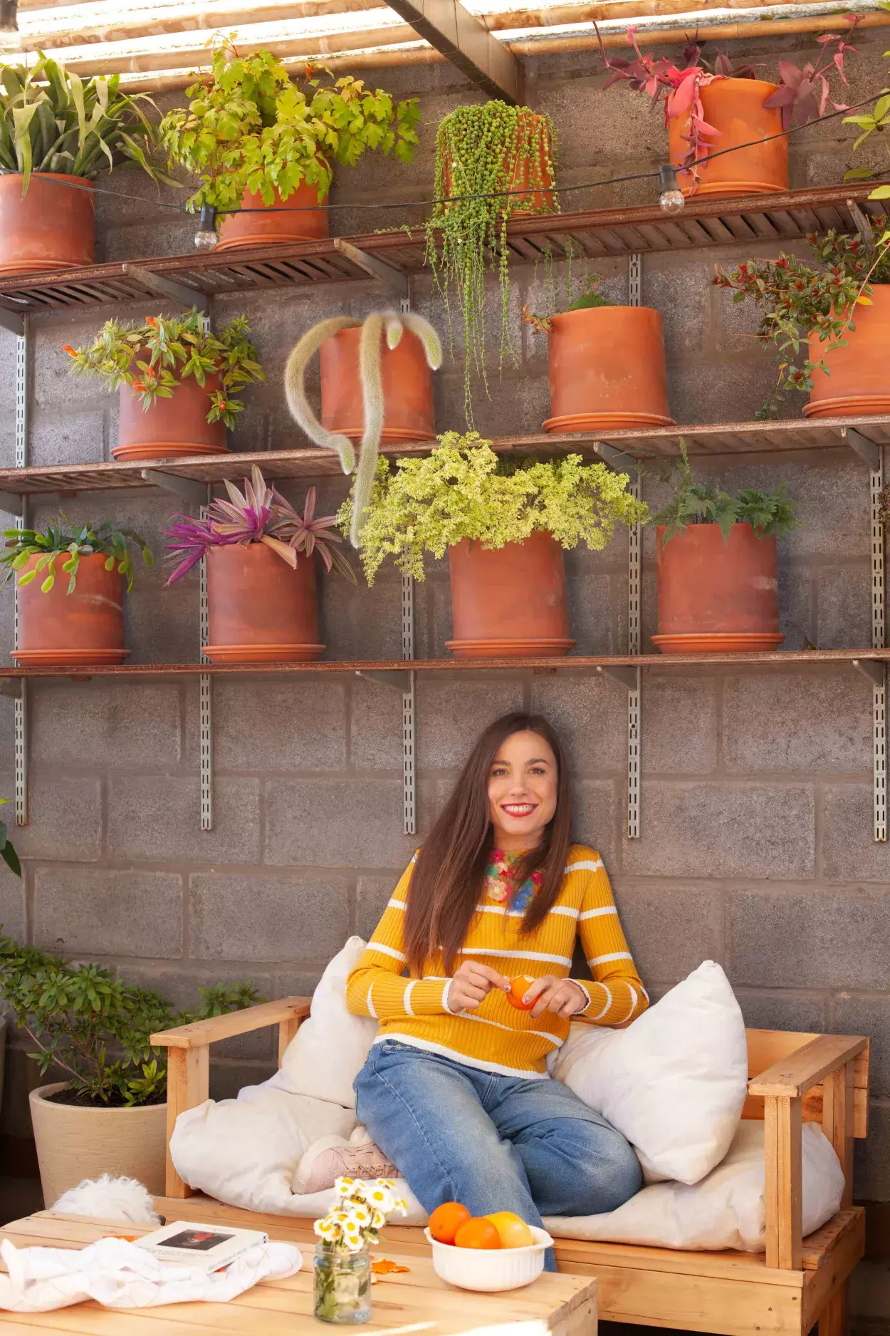 Se mudó a este depto con una silla de escritorio, sus libros y plantas: “Así, ya me sentía acompañada”, dice. A un año de habitar este hogar, asegura que es la casa de la amistad, porque siempre abre las puertas para compartir en este living del amor o en la terraza que llenó de plantas y arbolitos frutales, que la llevan a su ciudad natal.