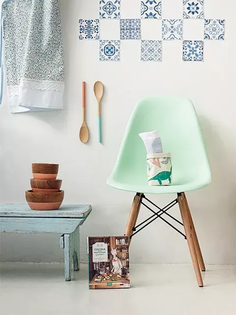 Delantal, Luz del Este, $420. Vinilos, Muur, $300. Cucharas de madera, À la Libertè, $75. Silla Kikely, tienda oficial de MercadoLibre, $1500. Cuencos de madera,À la Libertè, $200, $275 y $450. Banco de campo de pinotea vieja, Juan Terrenal, $830. Libro Cocina en el Boulevard by Limonada, Albatros, $320.