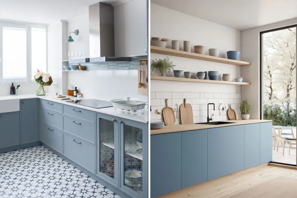 -Cocinas pequeñas: optá por un azul más suave en paredes y estantes, con muebles claros y buena iluminación.