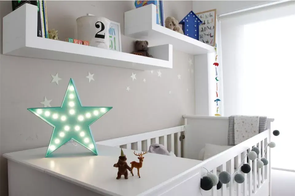 - Poné en el cuarto de los niños una estrella o letras con luz cuando se van a dormir y déjaselas encendidas, esto los va a ayudar a que se duerman solos sin oscuridad. Tené en cuenta este tipo de objetos: son ideales paralos chicos en la transición de dormir en la habitación de los papás a empezar a dormir solitos en su cuarto.