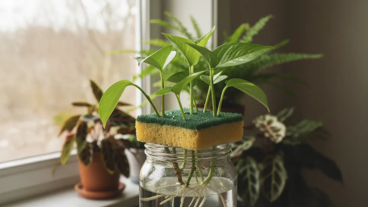 Pero hay un método casero, simple y muy efectivo, que no todos conocen: hacer crecer un potus usando una esponja de cocina. Este truco aprovecha la capacidad de la planta para enraizar en agua, y la esponja actúa como soporte natural, manteniendo la humedad justa para que el tallo genere raíces fuertes desde el inicio.