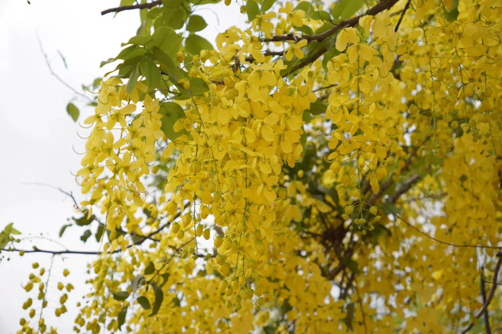 Durante la temporada de floración, se cubre de racimos colgantes de flores amarillas que asemejan una "lluvia de oro", creando un efecto visual impactante.