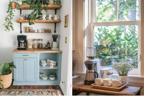- Un estante abierto con tazas y frascos que aporte calidez.