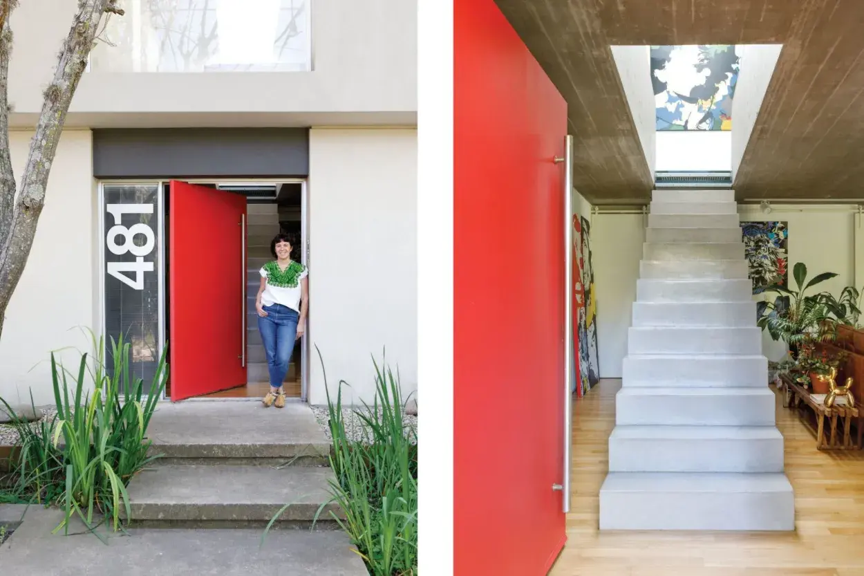 La gran puerta pivotante de esta casa en San Fernando cobra personalidad en su colorado brillante. Sin dudas, impacta. Rompe con el estilo fabril y completa el efecto cuando se abre y sorprende aún más una escalera que recuerda a una pirámide maya.