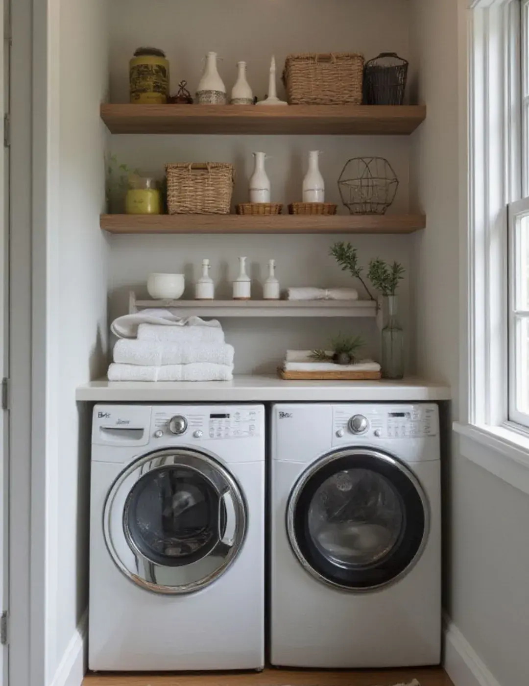 En espacios reducidos, aprovechar la pared es clave. En lugar de armarios cerrados gigantes, sumá estantes flotantes abiertos para colocar cestos de mimbre, toallas dobladas y productos. Esta solución deja respirar al ambiente, aporta textura y convierte al lavadero en un rincón con estilo, no solo funcional. Los estantes abiertos también te ayudan a ver todo de un vistazo, evitando el caos detrás de puertas cerradas.