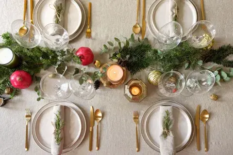 Variedad de vajilla. Para lograr una mesa navideña moderna y sofisticada, conviene combinar vajilla de diferentes estilos. Se pueden usar platos heredados con piezas más contemporáneas, y mantener la uniformidad en los cubiertos y copas para equilibrar el diseño y no perder la armonía.