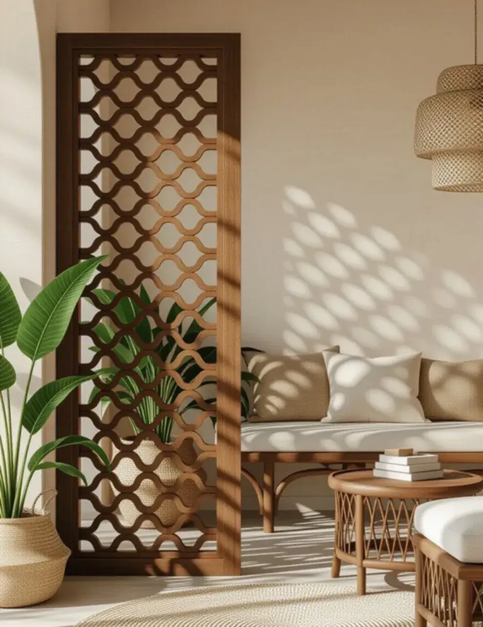 En lugar de los clásicos biombos, los paneles con diseños personalizados funcionan como separadores que son casi obras de arte. Pueden ser de madera, metal o acrílico y, además de dividir el living sin cerrar, aportan personalidad y estilo. Son ideales para delimitar un sector de lectura, un escritorio o incluso el comedor, manteniendo la sensación de amplitud y luz.