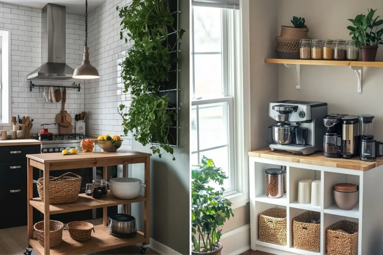 Mini estación de café: en departamentos pequeños, un mueble tipo carrito o módulo con puertas retráctiles puede transformarse en un rincón de café o té que se abre solo cuando lo necesitás.