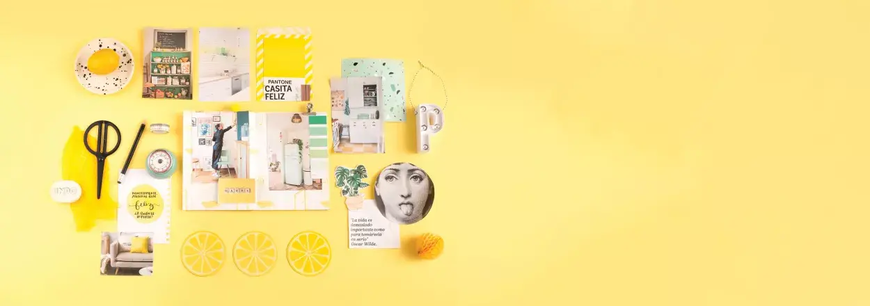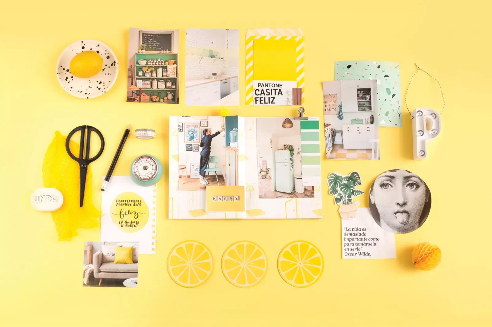 Creatividad y diversión: con nuestro objeto y paleta de colores definidos, ¡empieza la diversión! Es el momento de sumar al tablero todo aquello que nos haga felices. Lo ideal es no juzgar, solo juntar aquellas cosas que nos resultan inspiradoras, que nos dicen algo, que hablan de quienes somos (o de nuestra marca, por ejemplo). ¡Cuanto más, mejor! Lo ideal para un resultado interesante es sumar texturas, diferentes materiales, tamaños diversos (cuidando de que ninguno quede fuera de escala), frases, tipografías, fotos e imágenes que te inspiren, ilustraciones, humor, etc. Si es posible, guardar todo lo que vas juntando en una caja.